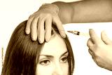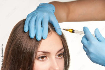 Young caucasian female receiving hair treatment injection by gloved hands in medical setting.