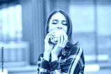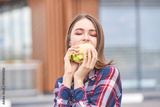 Young caucasian female enjoys delicious burger outdoors in casual plaid shirt.
