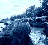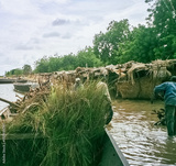 Niger River, Mali, July 25, 2006. Men unload bundles of reeds from a boat near rustic shelters on the riverbank, illustrating traditional transport, subsistence and riverside life.