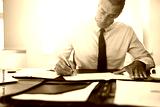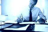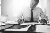 Businessman sitting at his office desk signing documents