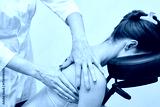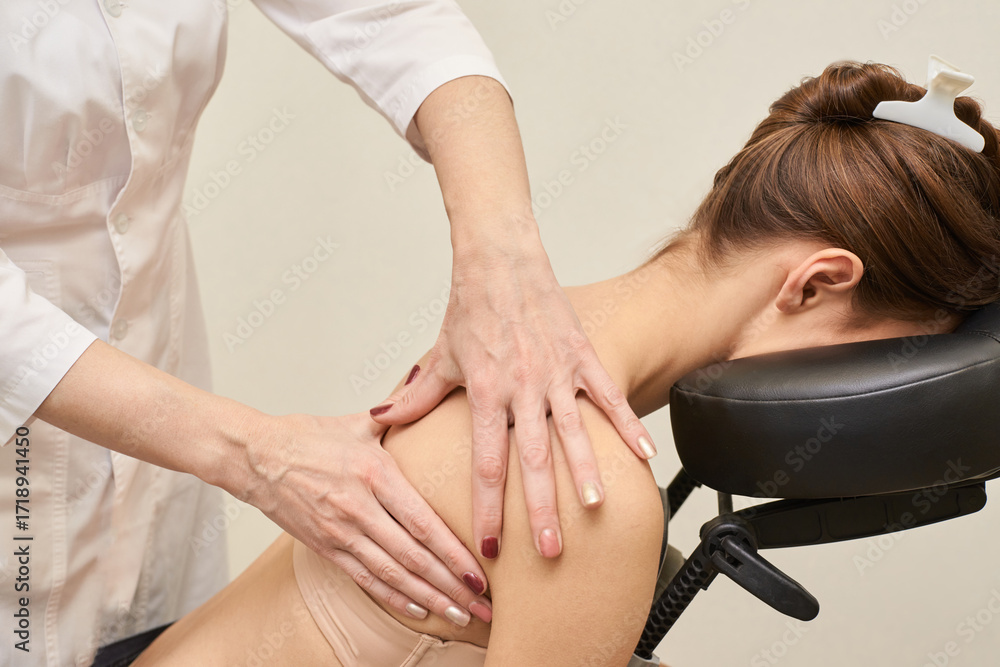 Female caucasian adult receiving shoulder massage in relaxing spa setting for wellness and stress relief.
