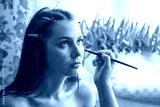 Young caucasian female getting makeup applied by hand indoors with natural light.