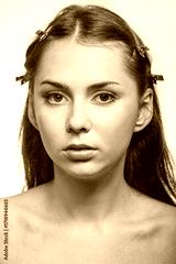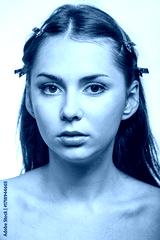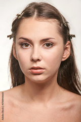 Young caucasian female with natural makeup and hair clips posing against a white background.