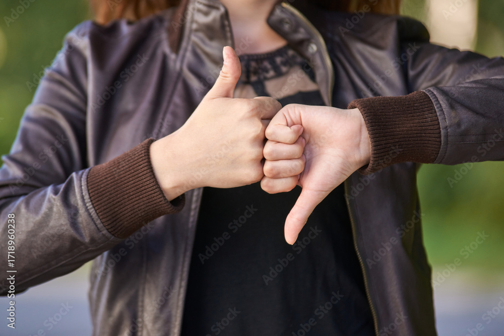 Young caucasian female showing thumbs up and down gesture wearing a brown jacket outdoors.