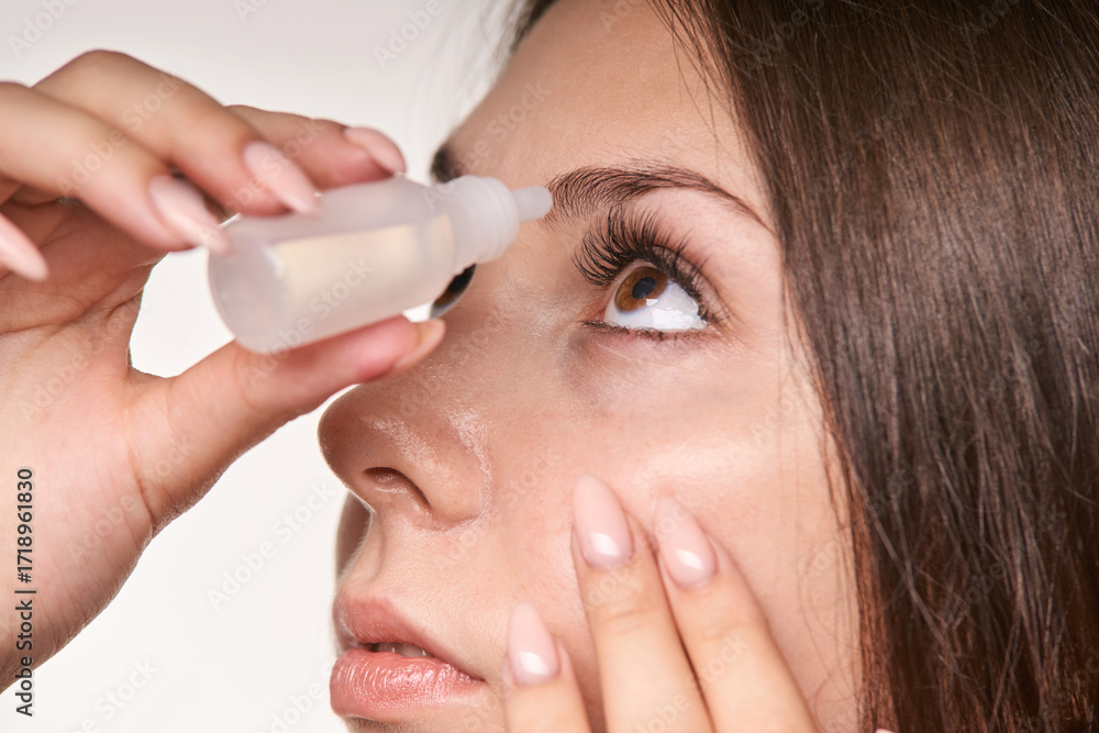Young caucasian female applying eye drops for dryness relief and eye care.