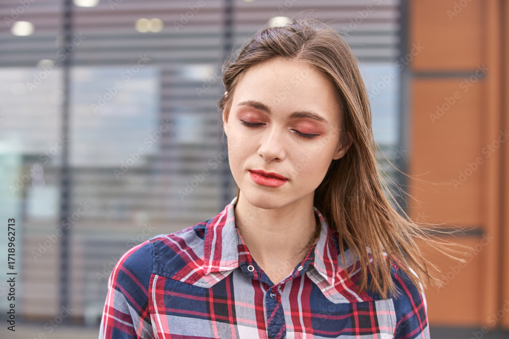 Caucasian young female with long hair in plaid shirt outdoors with eyes closed.