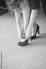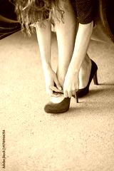 Female adjusting red high heel shoe while sitting with black shoe beside her.
