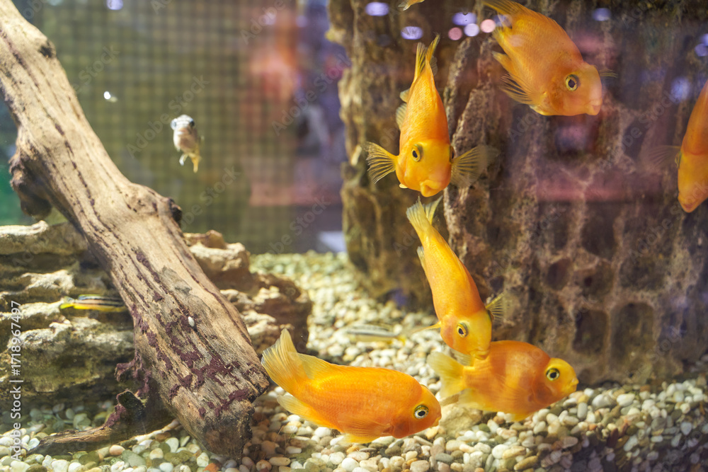 Vibrant orange fish in aquarium with driftwood and pebble floor.