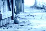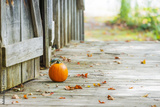 Small pumpkin sitting on wooden deck outside rustic barn doors, autumn leaves on ground