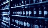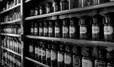 Bottles with drugs from old medical, chemical and pharmaceutical glass. Chemistry and pharmacy history concept background. Medicine, chemistry, pharmacy, apothecary, alchemy history background.
