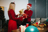 Four joyful friends gather for a festive Christmas party, exchanging colorful wrapped gifts around a table filled with delicious holiday food, balloons, and candles, creating a warm, cheerful