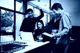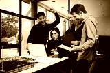 Four colleagues engage in a collaborative office meeting, using laptops, tablets, and documents to brainstorm ideas, discuss strategies,share insights, fostering teamwork, productivity, professional