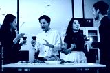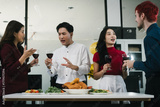 Four cheerful friends celebrate together in an office party, enjoying delicious food, fried chicken, pizza, salad, wine. Surrounded by balloons and laughter, they share happiness, marking year-end