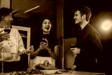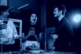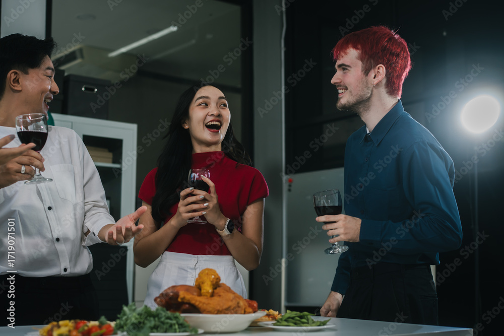 Four cheerful friends celebrate together in an office party, enjoying delicious food, fried chicken, pizza, salad, wine. Surrounded by balloons and laughter, they share happiness, marking year-end