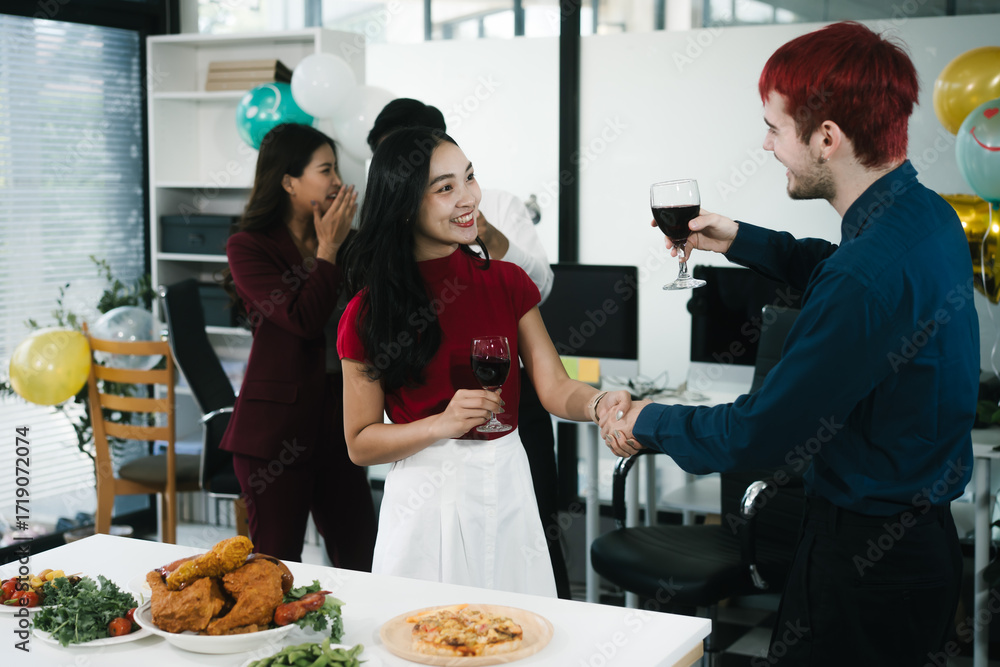 Four cheerful friends celebrate together in an office party, enjoying delicious food, fried chicken, pizza, salad, wine. Surrounded by balloons and laughter, they share happiness, marking year-end