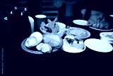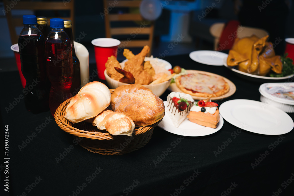 A cozy Halloween party dining scene at home with a black tablecloth, assorted dishes including cake and fried chicken, red cups,smiling jack-o’-lantern centerpiece, illuminated by warm dim lighting