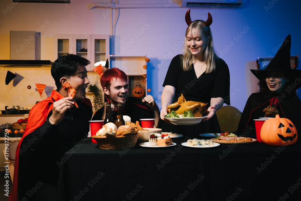 Four friends dressed as witches and devils celebrate Halloween together, holding pumpkins and decorations around a table with food and drinks. laugh and enjoy the spooky, festive atmosphere of party
