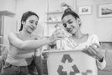 Two beautiful Asian women sorting plastic bottles for recycling at home.