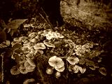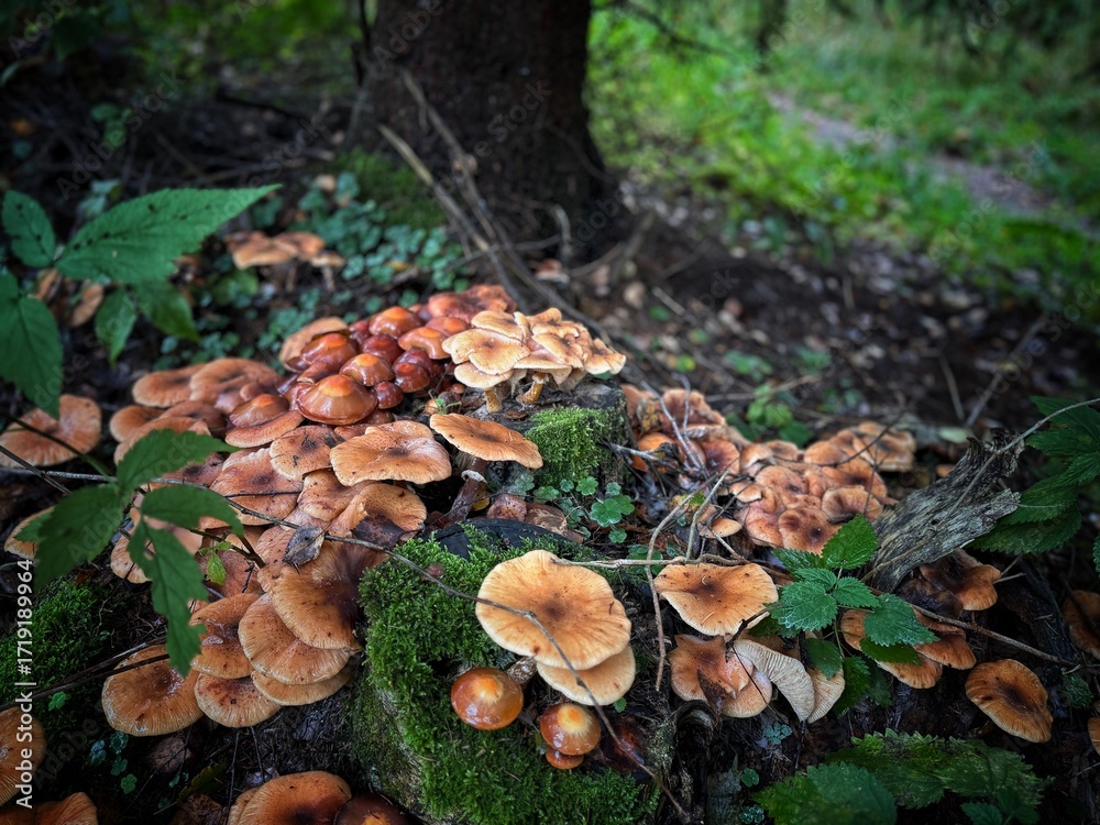 a stump covered with false honey mushrooms