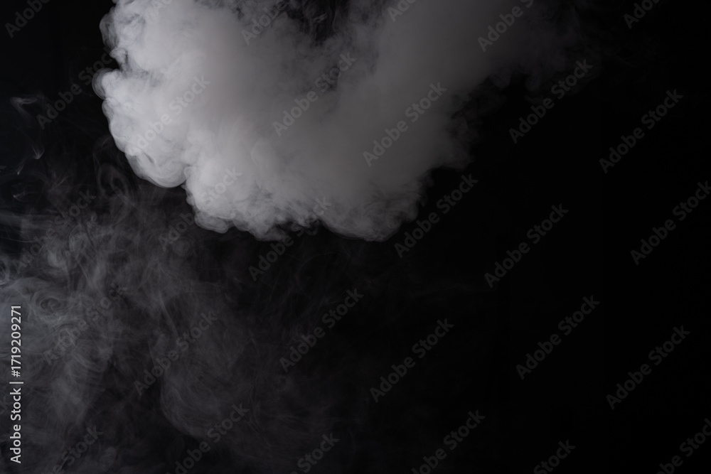 White smoke cloud on a black background, abstract texture of vapor or fog, concept of mystery, atmosphere, pollution, or stage effect.