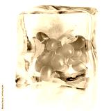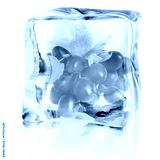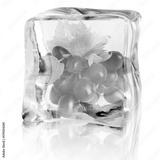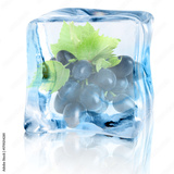 Fresh grapes with green leaves inside ice cube on white background