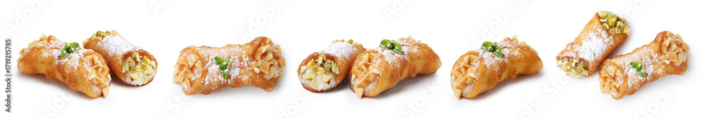 Delicious cannoli with cheese, nuts, powdered sugar and mint isolated on white, set