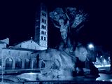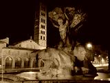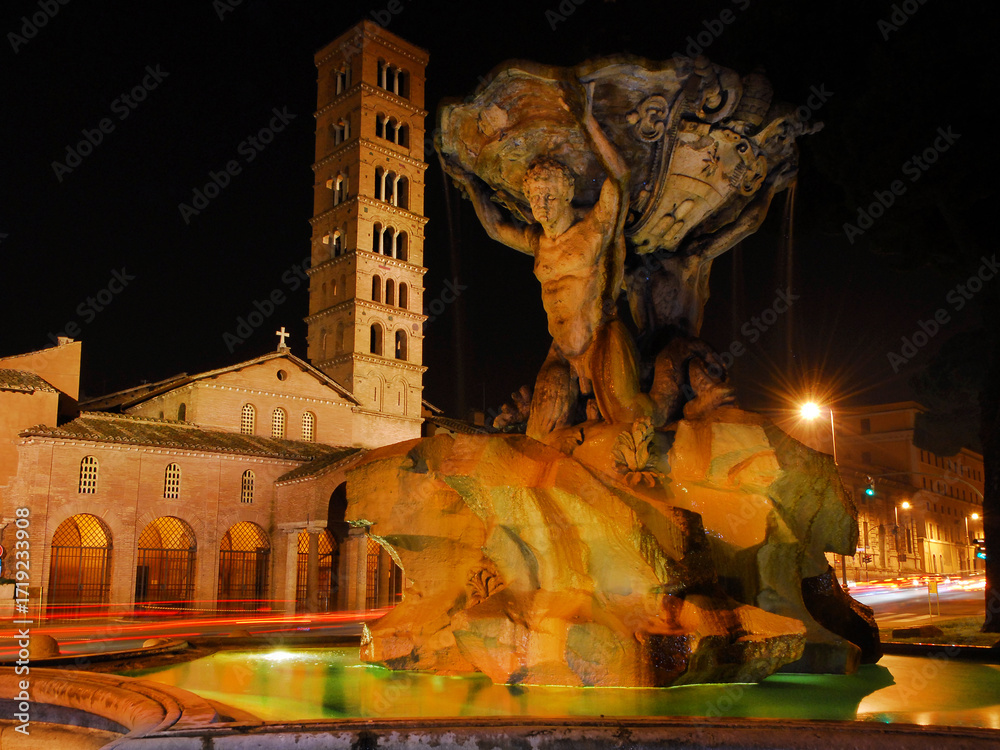 Beautiful baroque Fountain of the Tritons with medieval Basilica of Saint Mary in Cosmedin lit up at night in Rome