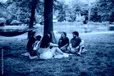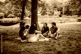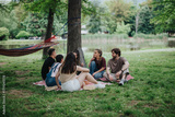 A gathering of diverse friends enjoying a casual picnic in a scenic park setting. They are seated on a grassy area near a hammock and surrounded by a peaceful lake and nature.