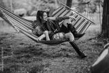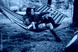 Two friends share a joyful and playful moment resting on a colorful hammock outdoors.