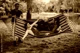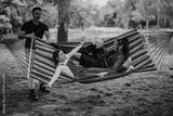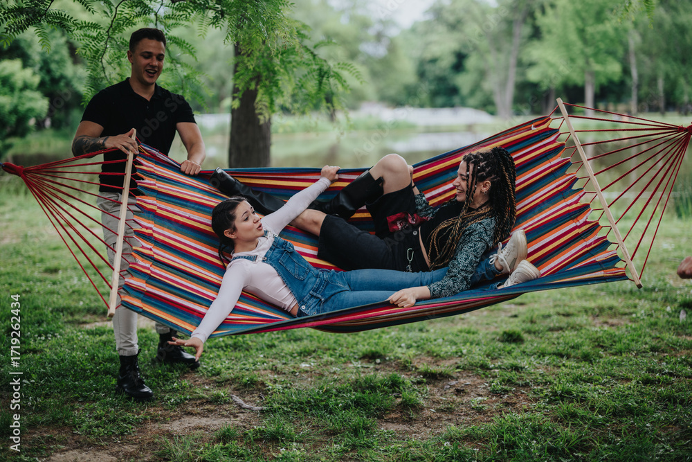Three friends enjoy playful moments with a hammock outdoors in a green park. They are laughing and creating joyful memories during their leisure time.