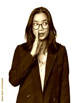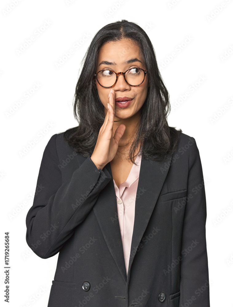 Young Latina professional in studio is saying a secret hot braking news and looking aside