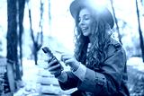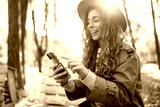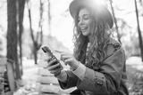 Portrait of cheerful woman in hat, using phone, sitting on bench in autumn park. Beautiful woman enjoys sunny day, using phone on wooden bench. Concept of blogging, relaxation, and seasonality.