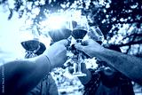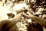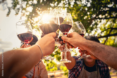 Group of friends toasting with red wine glasses against the sun. Low angle view of a celebration at sunset, concept of success, friendship and party in a vineyard.