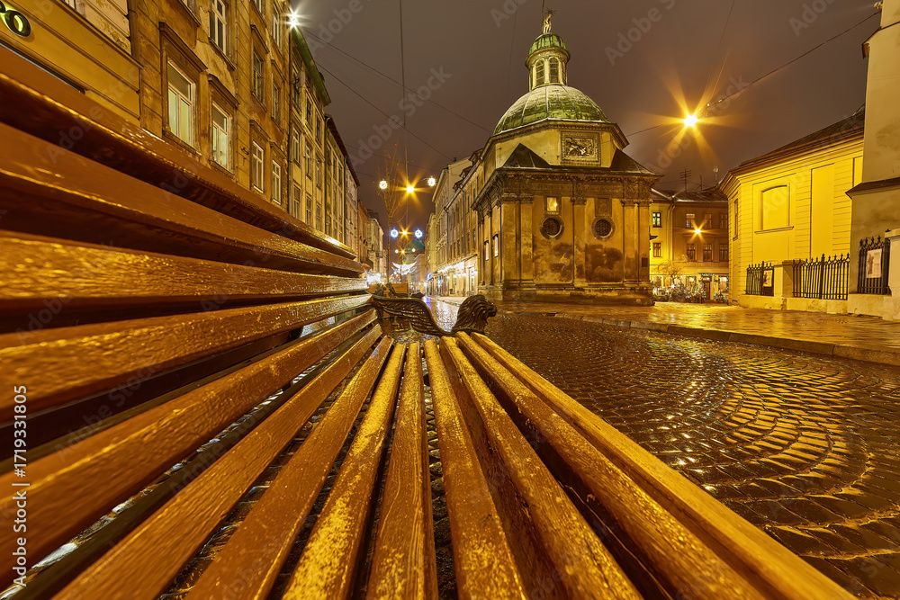 Historic European city square with a wet cobblestone street at night.