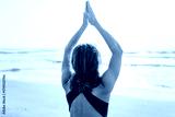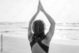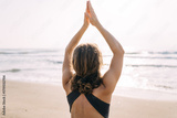 A beautiful woman in athletic clothing exercises on a yoga mat by the seashore. An athletic woman practices yoga and meditates outdoors. Concepts include nature, solitude, and meditation.