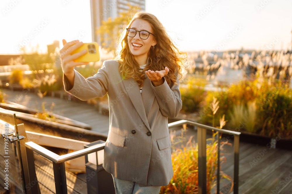 Portrait of a stylish woman wearing glasses and holding a phone, standing on a sunny rooftop. A beautiful woman takes a selfie on her phone, blogging outdoors. Blogging concept, technology. Lifestyle.