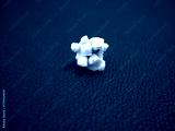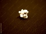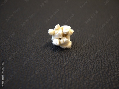 Minimal close-up of one popcorn piece placed on textured black leather surface.