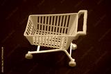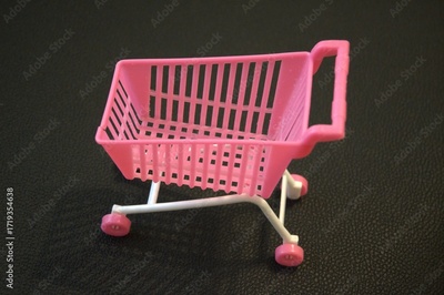 Empty toy shopping cart in pastel pink color placed on dark leather backdrop with copy space.