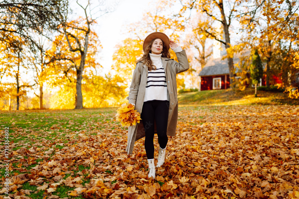 A happy woman is having fun in an autumn park at sunset. A beautiful woman in casual clothes throws leaves into the air on a sunny day. Concept of a walk, relaxation.