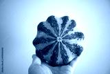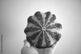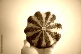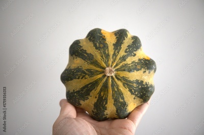 Person holding ornamental gourds in green and yellow color, photographed with clean white background and copy space.