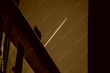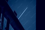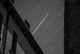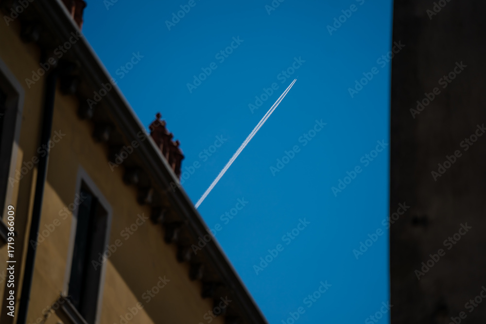 White jet trail cutting through clear bright sky behind silhouette of old city architecture with rooftop chimneys and shuttered windows in strong daylight contrast