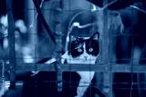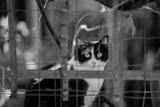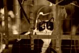 Tuxedo cat resting quietly in shaded outdoor corner behind mesh fence, watching surroundings with attentive look, plants and rustic textures forming natural background