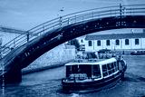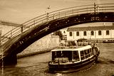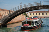 Tourist waterbus crossing quiet canal under rustic arched bridge in Venice, Italy, surrounded by sunlit historic architecture and reflecting vibrant maritime atmosphere