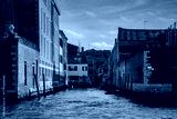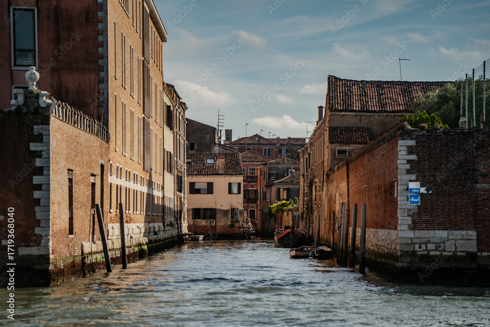 Narrow Venetian canal with historic brick buildings, weathered facades, mooring poles and traditional waterfront architecture under warm evening light in Italy