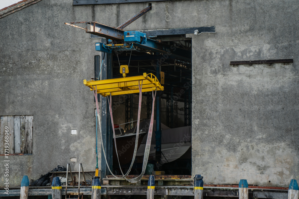 Boat lift inside industrial waterfront warehouse with yellow hoisting frame, suspended straps and marine vessel maintenance facility in Venetian lagoon district