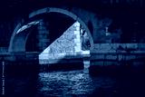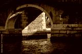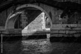 Stone bridge arch over Venetian canal with sunlight casting sharp diagonal shadow on water surface and rustic brick walls in historic Italian architecture