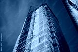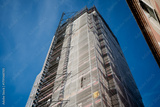 Urban architecture wrapped in scaffolding and safety mesh during renovation works, symbolizing transformation and renewal in contemporary city landscape