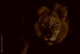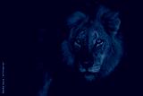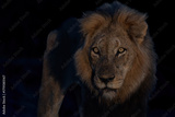 Dominant male lion hunting in the spotlight in the night in Sabi Sands Game Reserve in the Greater Kruger Region in South Africa