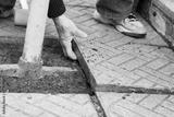 Repair of the tile pavement. Installation of paving slabs. Man using a pickaxe removes old pavement.
