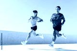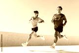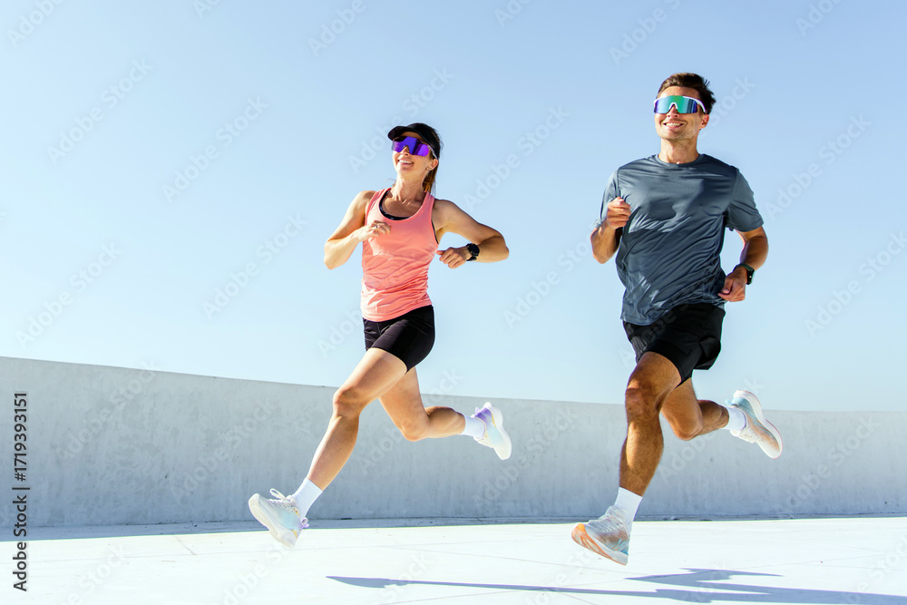 Couple jogging together on a bright day at an outdoor training location